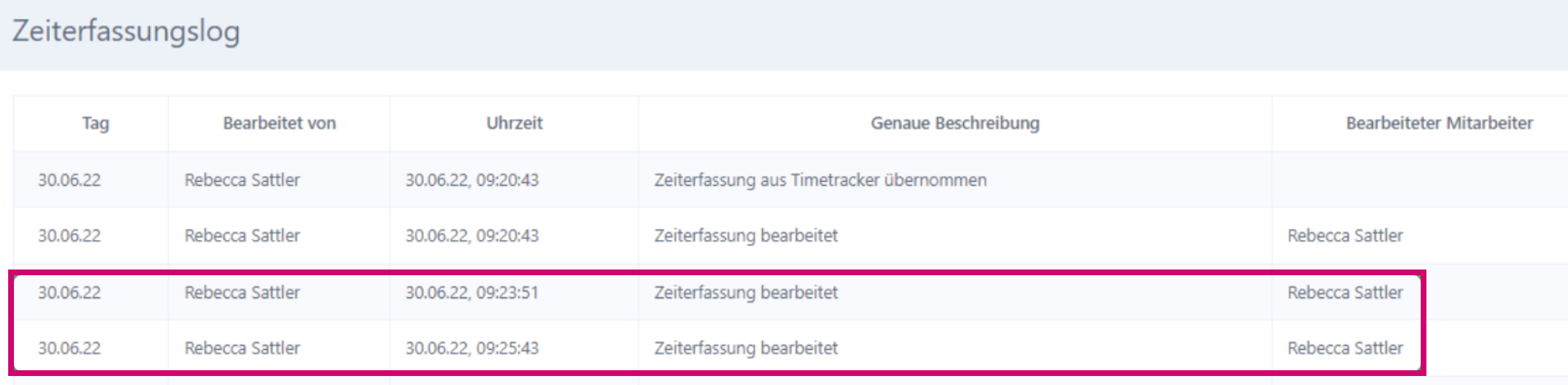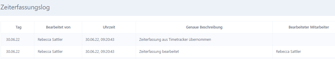 Jede Änderung öffnet eine eigene Beschreibung "Zeiterfassung bearbeitet"Beispiel "Zeiterfassung aus Dienstplan übernommen"
