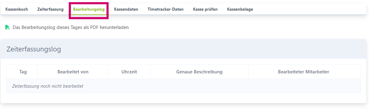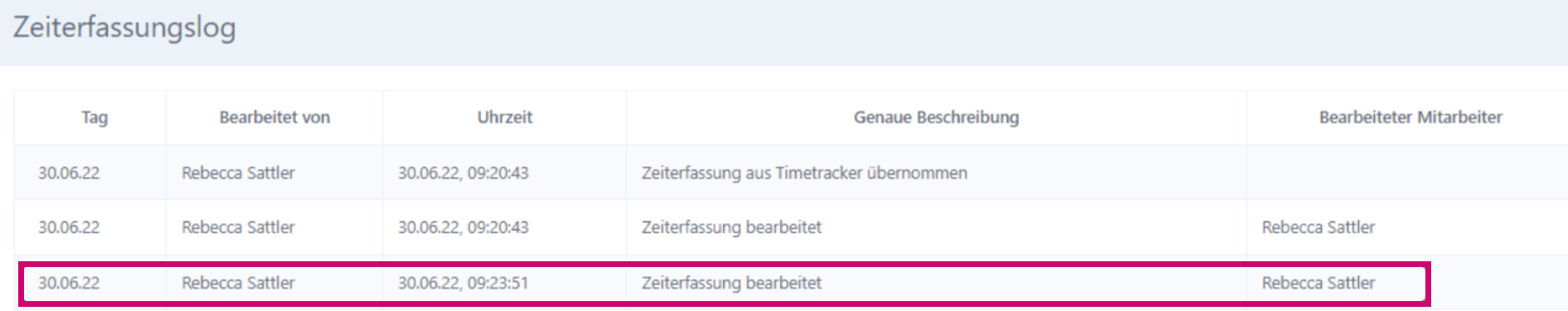 Der Bearbeitungslog schreibt mit, wer wann eine Änderung in der Zeiterfassung vorgenommen hat.