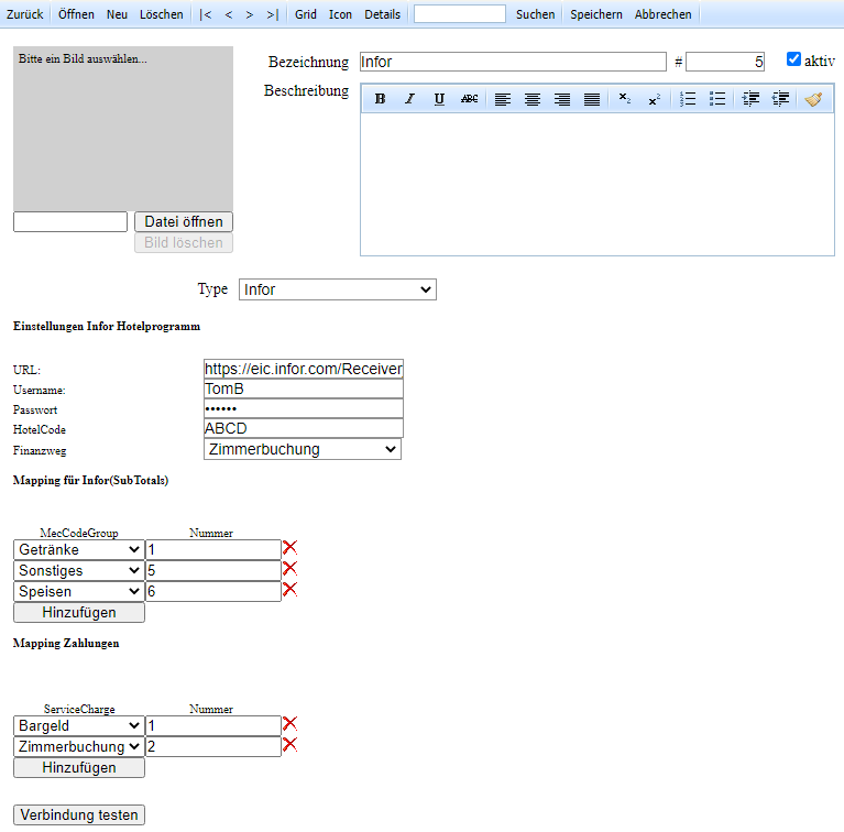 Im Backoffice unter Schnittstellen auf "Neu" klicken. Als Type "Infor" einstellen. Die Felder "URL", "Username", "Passwort" und "HotelCode" werden von Infor mitgeteilt. Als "Finanzweg" ist der zuvor angelegte Finanzweg einzustellen.