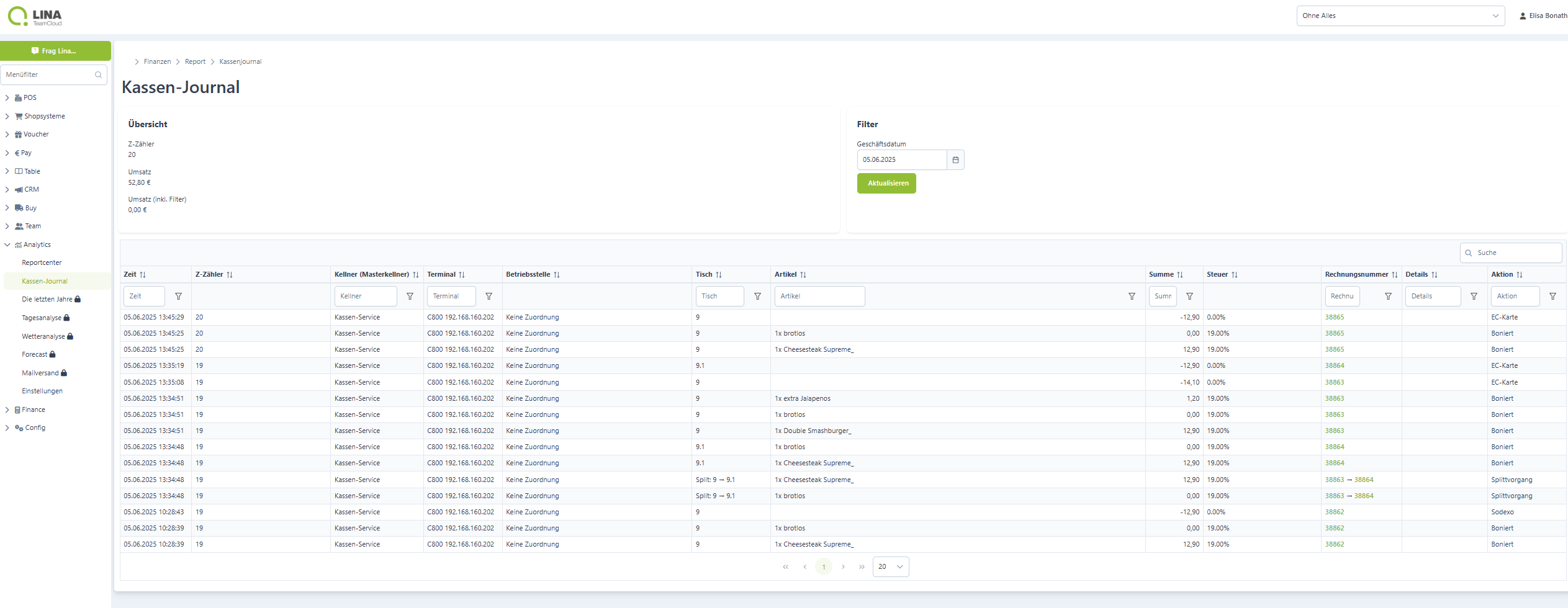 Sofern dein LINA Betrieb mit deiner Kasse per Daten-Synchronisation verbunden ist, hast du, mit dem Journal,