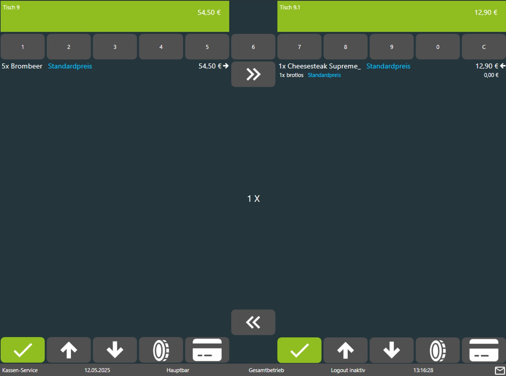 Öffne den Tisch, der umgebucht werden soll. Gebe über den Ziffernblock die Ziel-Tischnummer ein und bestätigen diese mit der Taste