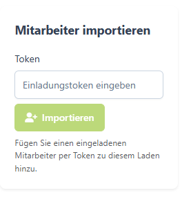 Wenn dein Mitarbeiter nicht nur bei dir angestellt ist, sondern ebenfalls in einem anderen Store und hier bereits als Mitarbeiter hinterlegt worden ist, dann kannst du den Mitarbeiter per Token in deinen Laden importieren. So kannst du als ein User in mehrere Stores.