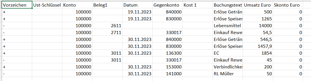 Exportierst du die Buchungsliste Kasse im Datev - Rechnungswesen Pro - Datev-Format so werden dir alle Geschäftsvorfälle die im Kassenbuch einlaufen exportiert. Damit sind die automatisch einfließenden Buchungen und die manuell eingetragenen Daten in einem Export zusammengefasst.