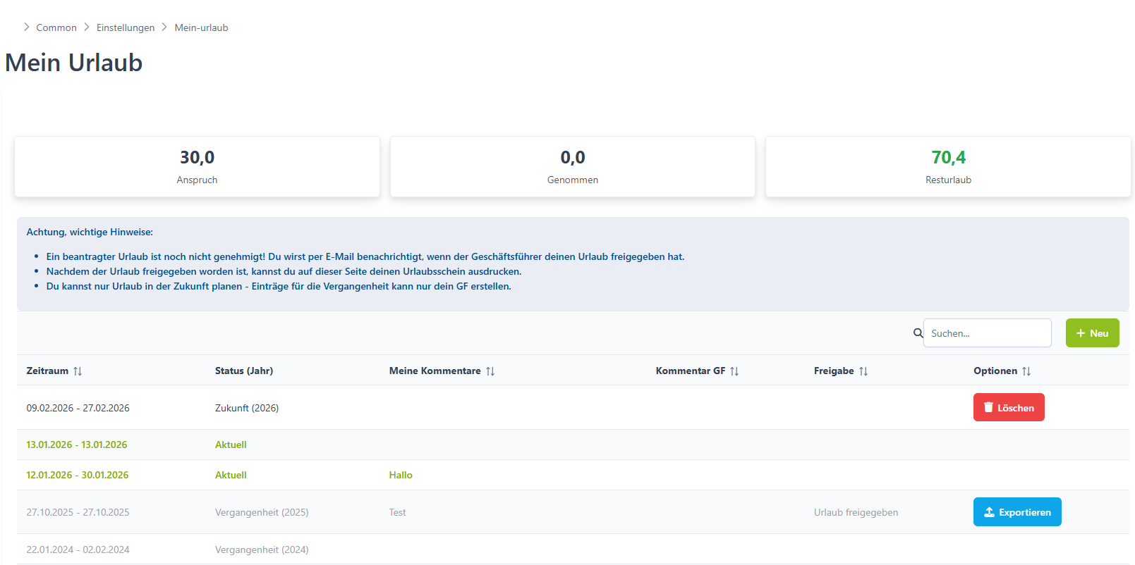 | Optionen | Löschen, wenn du einen zukünftigen Urlaubsantrag zurückziehen willst. Exportieren, wenn du für einen genehmigten Urlaub den Urlaubszettel noch einmal anzeigen willst. |