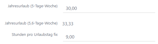 Möchtest du eine fixe Stundenanzahl pro Urlaubstag vergeben, so musst du diese hier im Feld "Stunden pro Urlaubstag fix" hinterlegen.