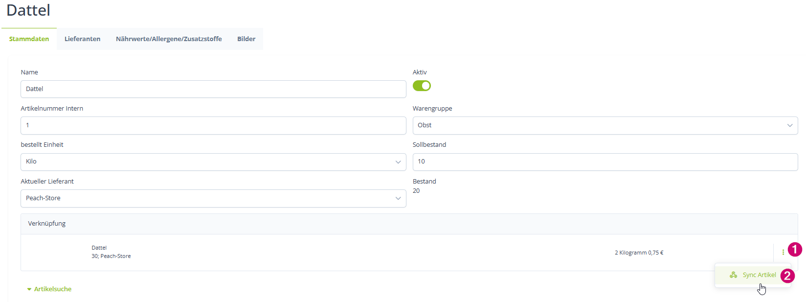 Auf der Stammdaten-Seite findest du rechts unten drei Punkte und wenn du auf diese klickst, Sync Artikel: