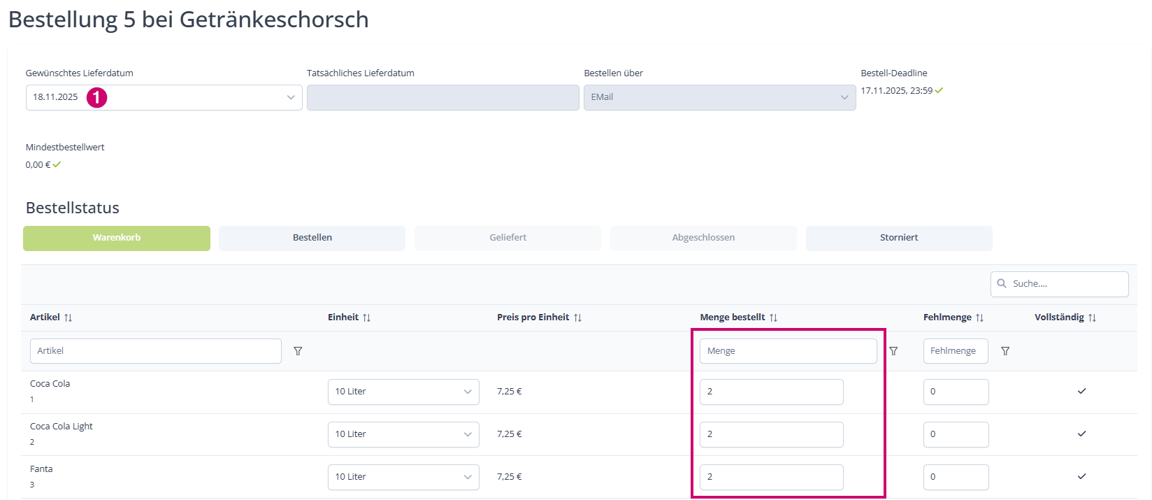Bei Artikeln die eine Fehlmenge enthalten haben, wird uns die Menge bereits voreingestellt. Aber auch diese können wir manuell ändern: