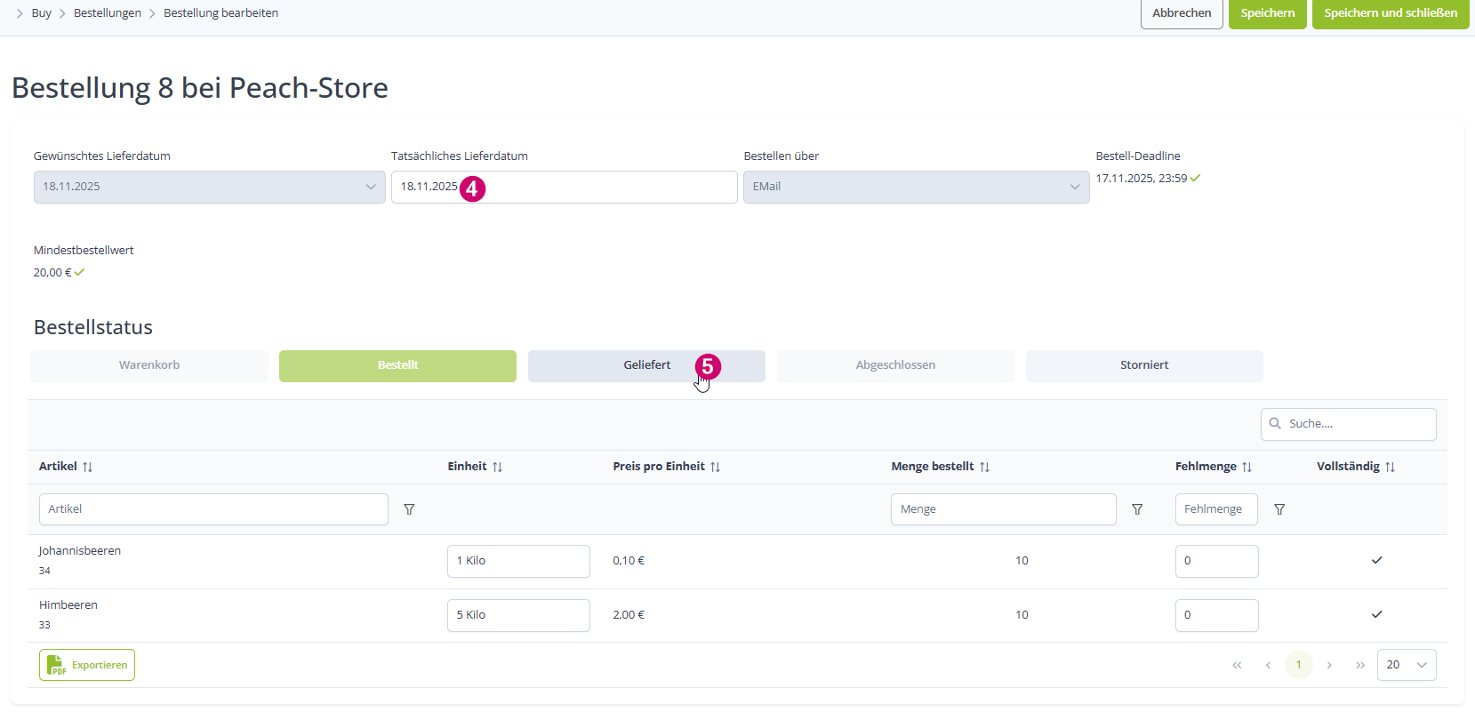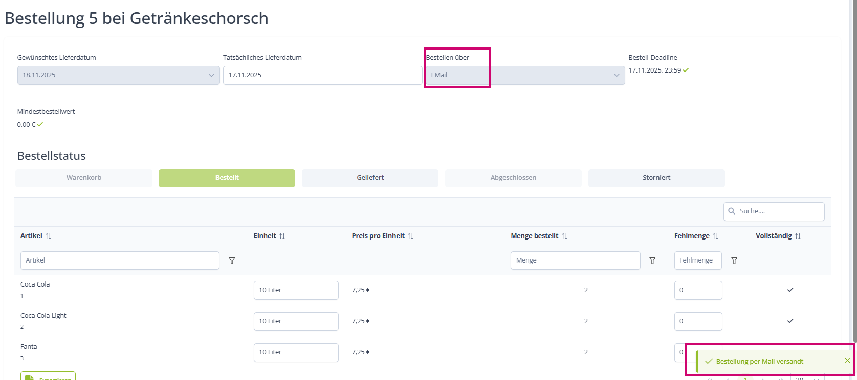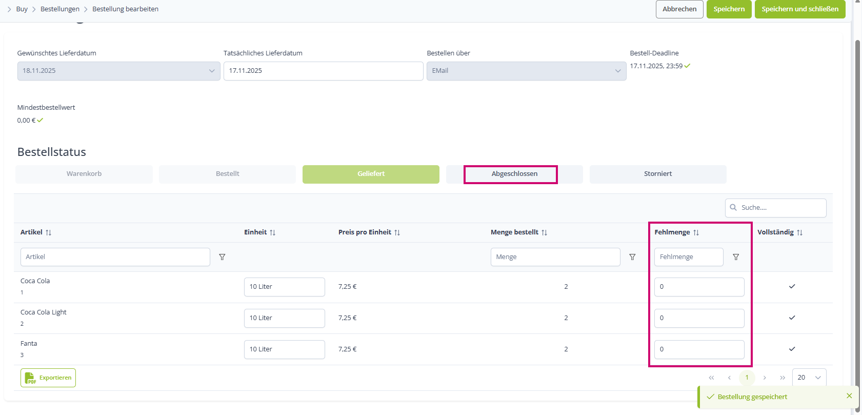 Nun könntest du angeben ob es Fehlmengen gab und die Bestellung abschließen:
