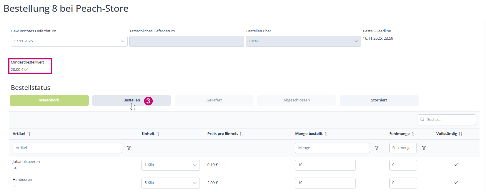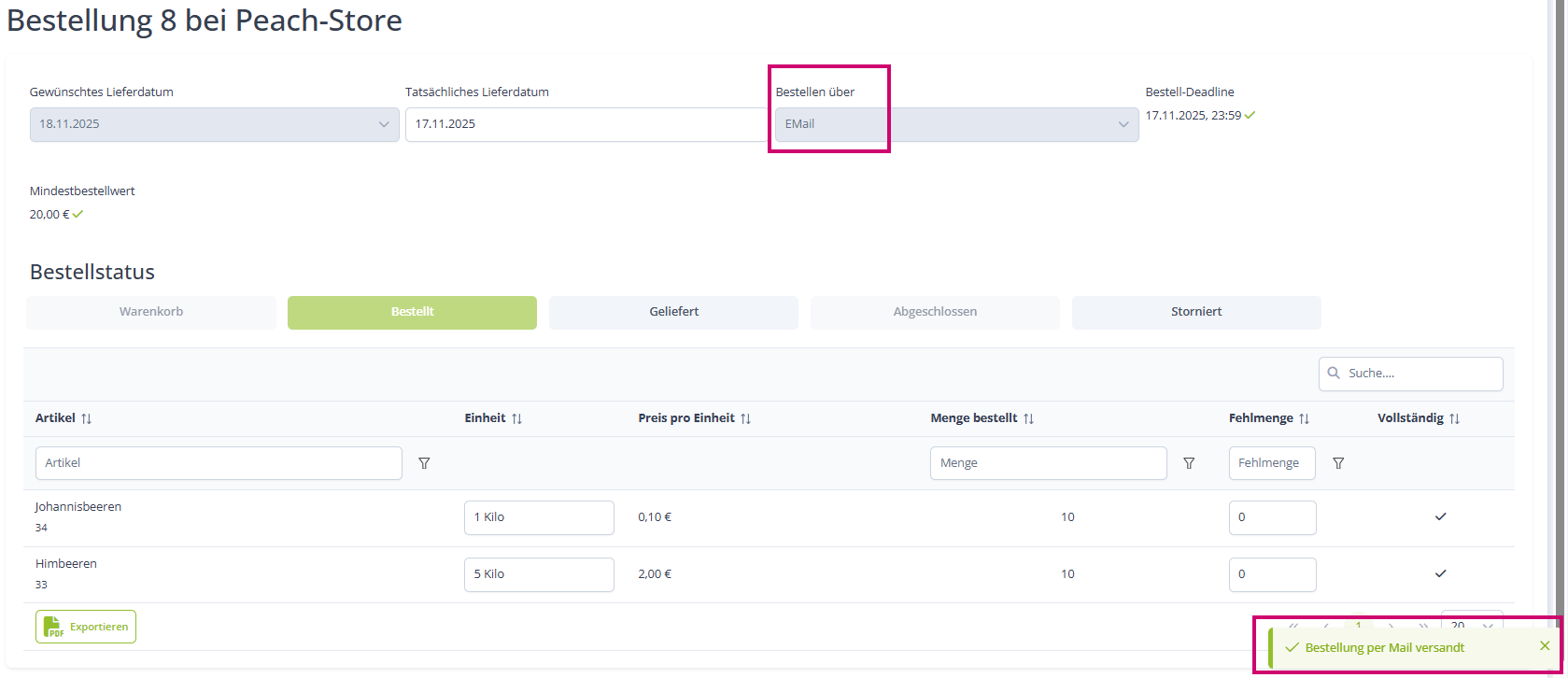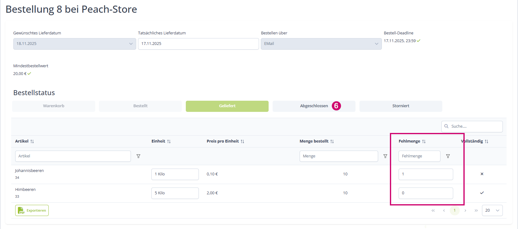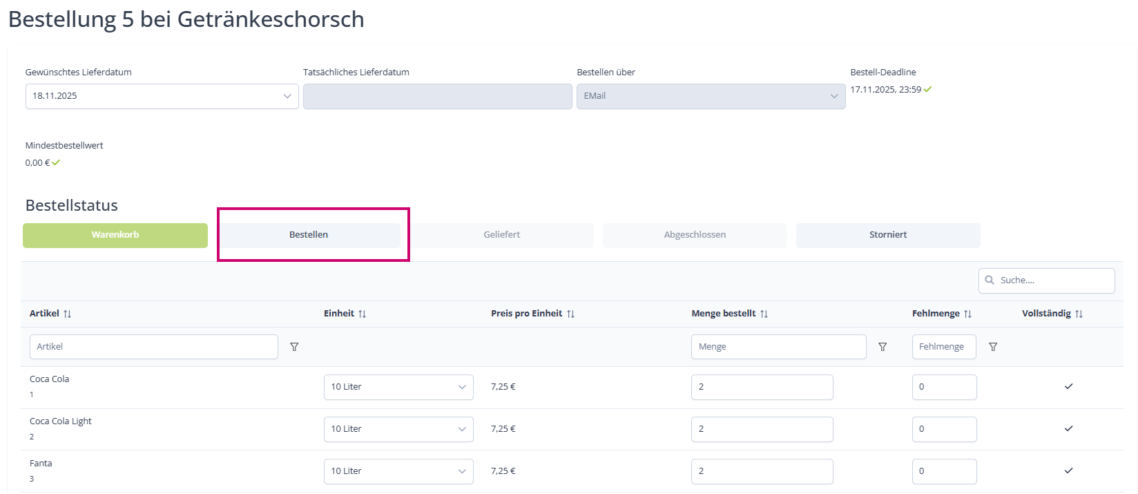 Nun könntest du angeben ob es Fehlmengen gab und die Bestellung abschließen: