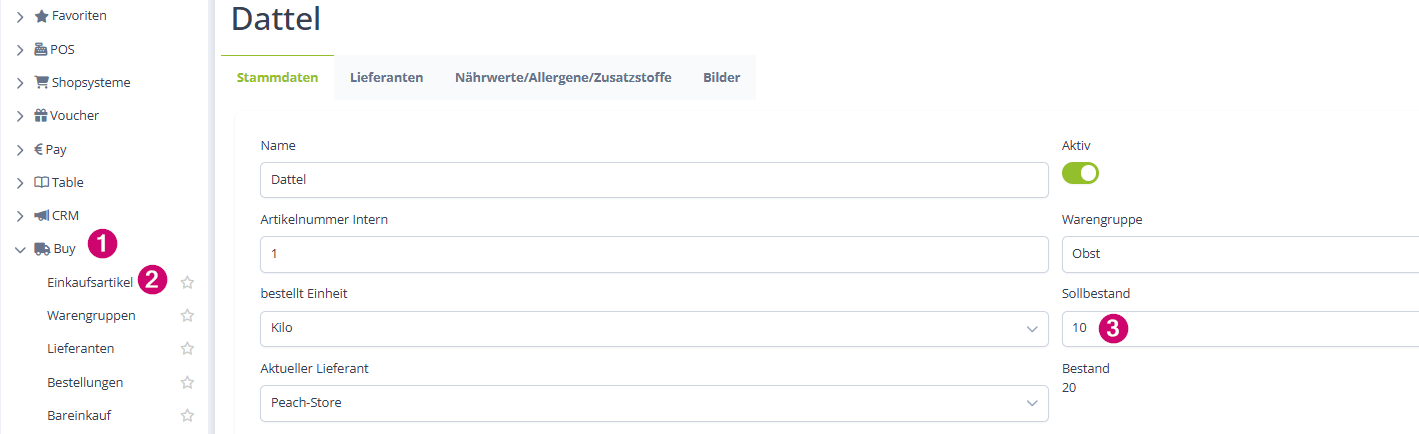 Der Sollbestand wird im Einkaufsartikel in den Stammdaten erfasst: