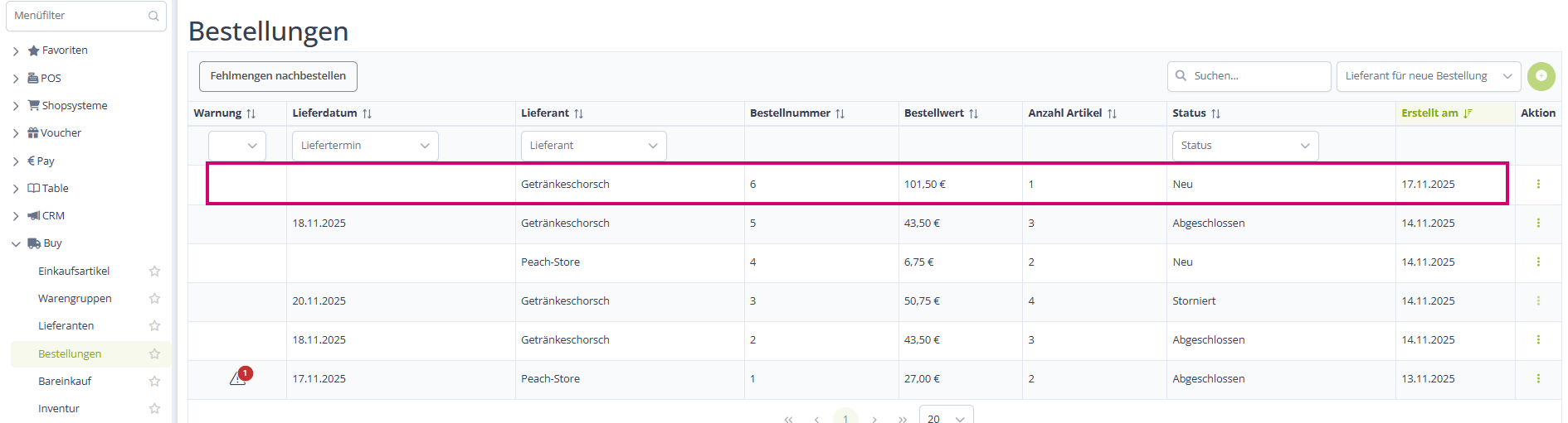 Handelt es sich um mehrere Lieferanten, werden dir mehrere Bestellungen vorbereitet. Diese findest du alle mit dem Zusatz "Neu" bei "Bestellungen":