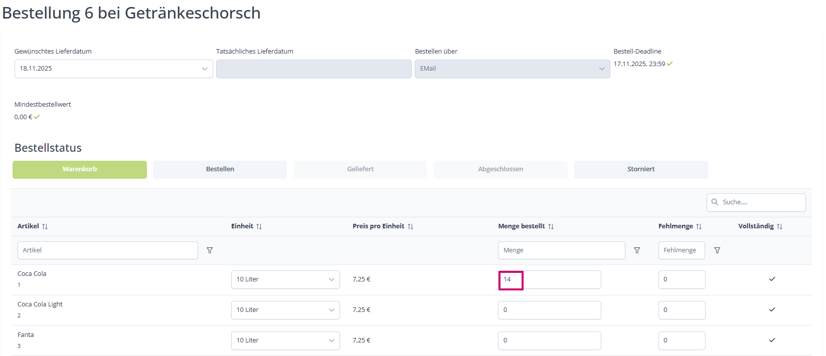 Wenn wir in die Bestellung klicken, werden uns erstmal alle Artikel bei dem Lieferanten angezeigt, wir können nun die Mengen ergänzen die wir bestellen wollen.