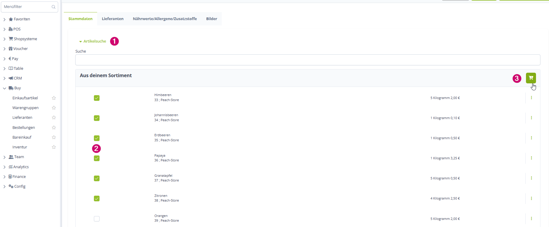 Du klappst die Artikelsuche aus und klickst alle Artikel an, die du im Warenkorb haben möchtest.