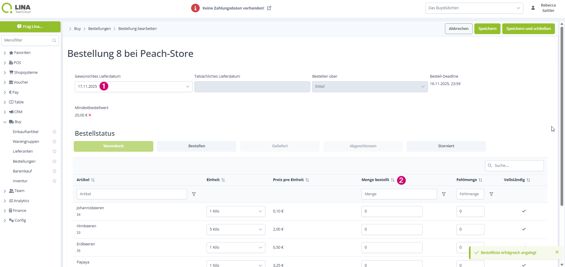 Nun wird dir deine neu vorbereitete Bestellung geöffnet, du wählst das gewünschte Lieferdatum aus und gibst die gewünschte Menge ein: