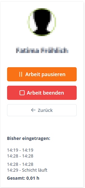 Arbeit neu starten: Solltest du dich aus Versehen mit „Arbeit beenden“ ausgestempelt haben oder in Teilschichten arbeiten, kannst du hiermit die Arbeitszeit fortsetzen.